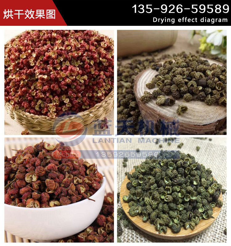 传统的花椒干制方法是集中晾晒或用阴凉干燥处阴干,所需时间比较长,一般需6-10天,并且在此期间如果遇到阴雨天气就容易出现霉变等问题造成损失。现在多采用烘干机设备进行干制,烘干后的效果比太阳照射要好,烘干后颜色不变,没有损伤,无污染,完全达到国家对食品卫生的需求。